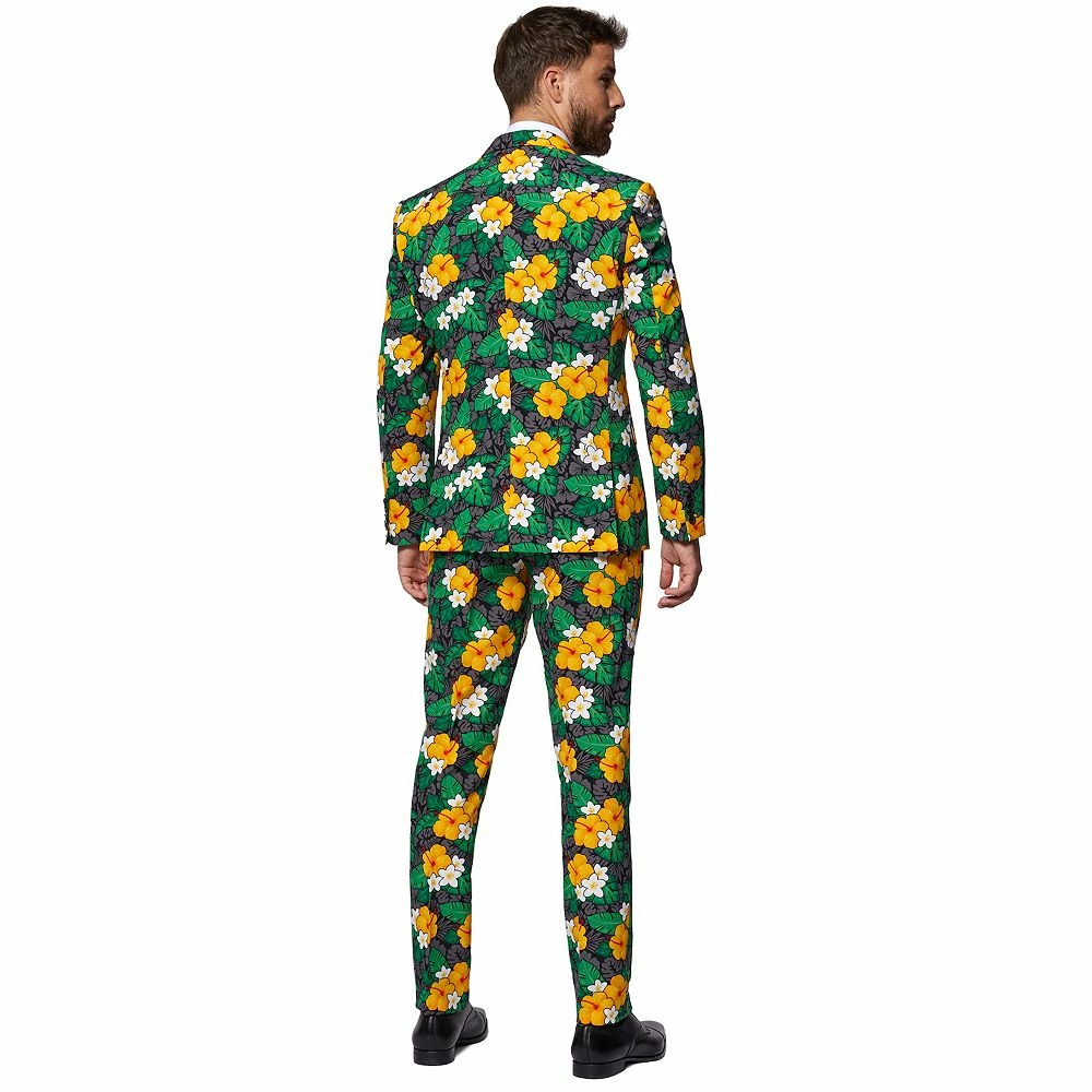 Flower power. Your style will bloom in this men’s OppoSuits Tropical Treasure Flower novelty suit and tie set.